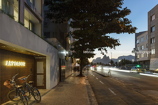 The project for the renovation of the Hotel Arpoador goes beyond the idea of a cozy hotel, creating an inviting space, where interior and exterior are blended. Its lobby is integrated into the bar through a patio bathed in natural light, a continuous line connecting Francisco Otaviano and Francisco Bhering streets. The façade is composed of a large wooden panel loose from the structure, which frames the views for those who see from within and creates a subtle order for the building.