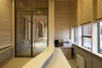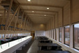 Estos volúmenes son conformados por una secuencia de marcos de madera laminada apoyados sobre zócalos de hormigón parcialmente enterrados en la pendiente. Estos zócalos corresponden a las instalaciones de servicios técnicos de los edificios como son la Sala de Filtrado, el Taller de Carpintería, bodegas y el Pañol de Buceo. text from author