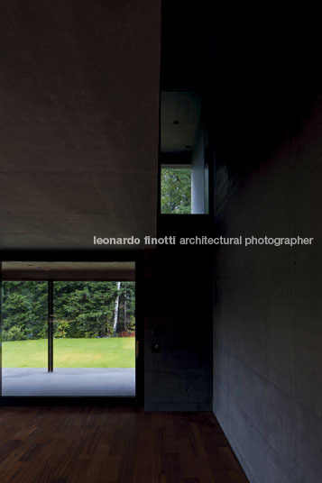 This unique semi-detached house is located in the community of Kastanienbaum (“Chestnut Tree”), not far from the City of Lucerne and on the shores of Lake Lucerne. In fact, the property abuts the lake at a woodland area mixed with oak, birch, chestnut and evergreen trees. Imagine the feeling of a stroll in the forest with its atmospheric interplay of light penetrating dense shadows, all leading to a flowering meadow; the goal of retaining this feeling played a major role from the project’s very conception.. The new construction is being located in this picturesque landscape in such a way that only a minimum of the existing terrain is being taken for the actual building. From a concrete deck, a ramp ushers you to the building where a concrete overhang defines the veranda area; from there, a wide stairway leads into the forest. The new exterior space attempts to preserve the existing atmosphere and is covered with a thick grove of birch and cherry trees as well as hedges. The strong presence of the landscape reinforces the perception of living in nature.